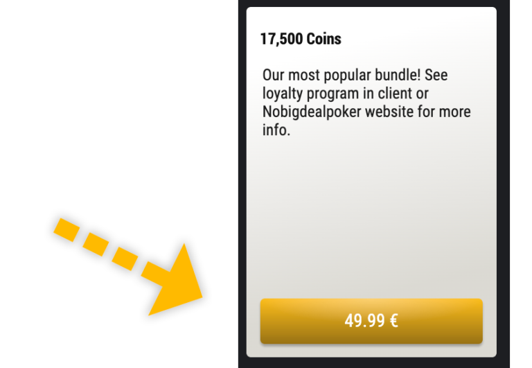 How To Purchase Coin Bundles at no big deal poker 1. Log-in to the NBDP clientClick on ‘Store’ 2. Choose the coin bundle you would like purchase Click on the image for more information 3. Click on the yellow button when you want to complete a purchase Choose your preferred method, fill out the required fields 4. Check your updated wallet and enjoy NBDP! How To Purchase Coins How To Purchase In-Game Features How To Register at No Big Deal Poker How To Purchase Coins How To Purchase In-Game Features How To Register at No Big Deal Poker